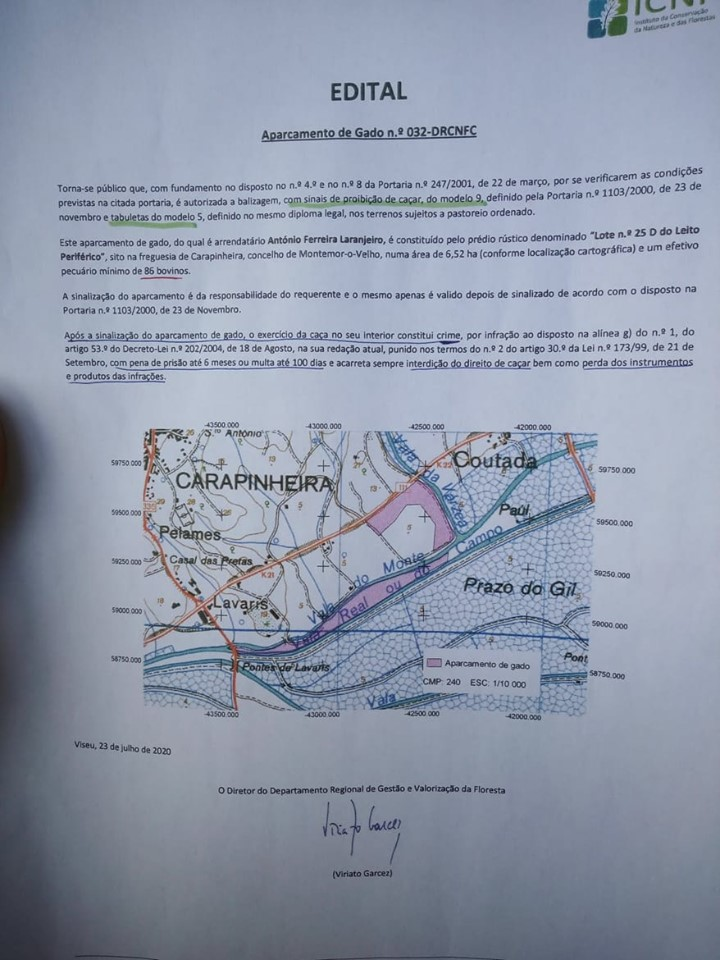 Informam-se todos os associados do Clube de Caçadores da Carapinheira, que exercem na sua ZCA a atividade cinegética, que, está autorizado pelas entidades competentes um aparcamento de gado, conforme edital que se publica, a fim de não existirem dúvidas da sua zona de implementação e limites. Mais se solicita que todos respeitem os seus limites uma vez que exercer o ato venatório no seu interior constitui crime.